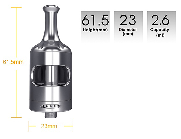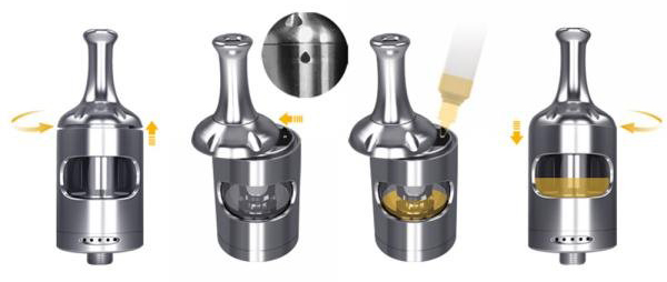 • Reglaj superior al fluxului de aer la baza atomizorului, debitul putand fi setat dupa preferinta, in functie de tipul rezistentei utilizate. Orificiile mici sunt perfecte pentru rezistentele MTL de1.8ohm, iar cand se utilizeaza rezistente de 0.4ohm si 0.7ohm, aerul se poate deschide la maxim pentru o productie ridicata de aburi.