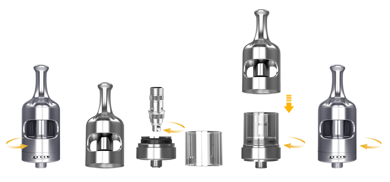 - Intoarce clearomizorul cu mustiucul in jos si invarte baza acestuia pentru a o inlatura