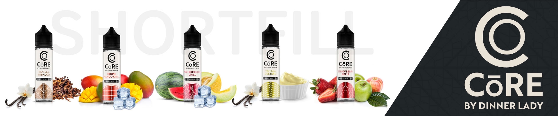 Contine 1 flacon Lichid tigara electronica 50 ml Core by Dinner Lady, 70%VG 30%PG, fabricat in UK.
