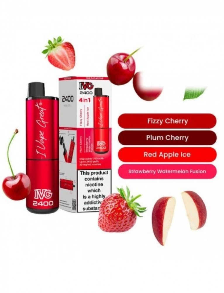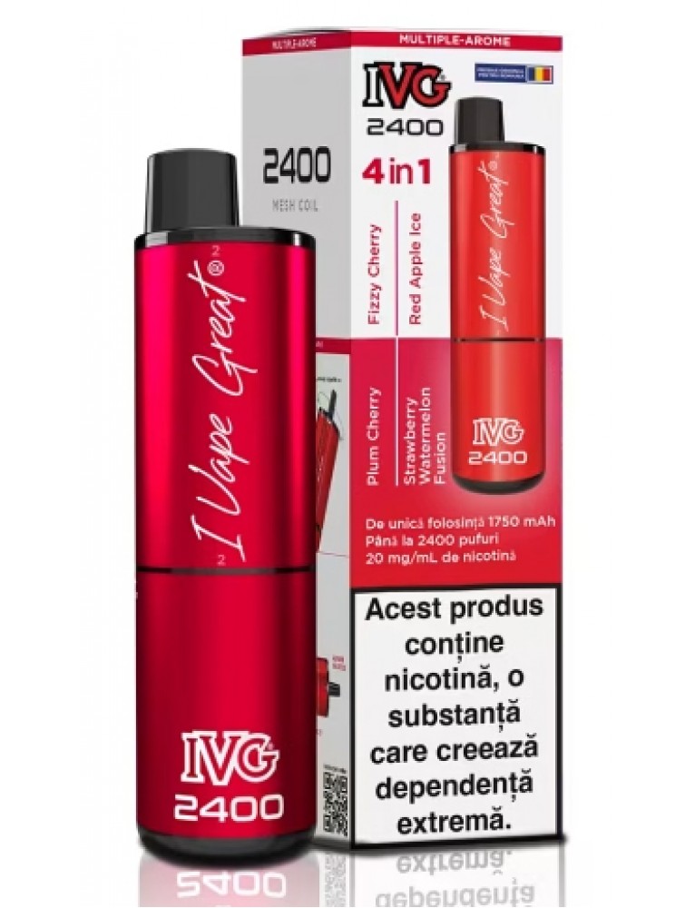 IVG 2400 Red Edition 4 in 1 cu multi arome - 4 cartuse cu arome diferite intr-o singura tigara: Plum Cherry, Fizzy Cherry, Strawberry Watermelon Fusion, Red Apple Ice.