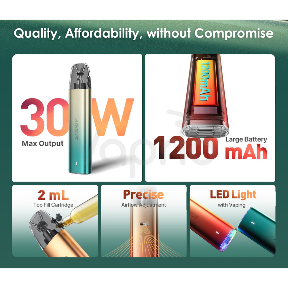 • Compatibilitate si versatilitate: ARGUS G2 Mini este compatibil cu toate cartusele din familia ARGUS Pod, oferind o varietate de experiente de vaping, de la MTL la RDL. Cartusele sunt disponibile in diferite capacitati si rezistente pentru a se potrivi preferintelor individuale.